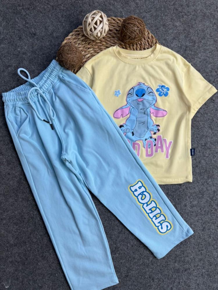 نقدم لكِ ترنج بناتي رائع، يجمع بين الألوان الهادئة والتصميم المريح، مثالي للخروجات والأنشطة اليومية. هذا الطقم المميز يتكون من قطعة علوية (تي شيرت) باللون الأصفر الزاهي، مزينة بـ"رسمة ستيتش" (Stitch) الشهيرة. ويكمله بنطلون باللون الأزرق السماوي الهادئ والمريح، مما يمنح طفلتكِ إطلالة حيوية وناعمة. صمم خصيصًا ليناسب أجواء السعودية، ليقدم لطفلتكِ الراحة والأناقة في آن واحد.