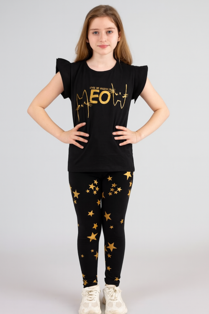 - التصميم: لون أسود أنيق مزين بطباعة ذهبية مقاومة للتقشير، مع عبارة meow المميزة على الصدر لإضفاء لمسة عصرية وفريدة.
