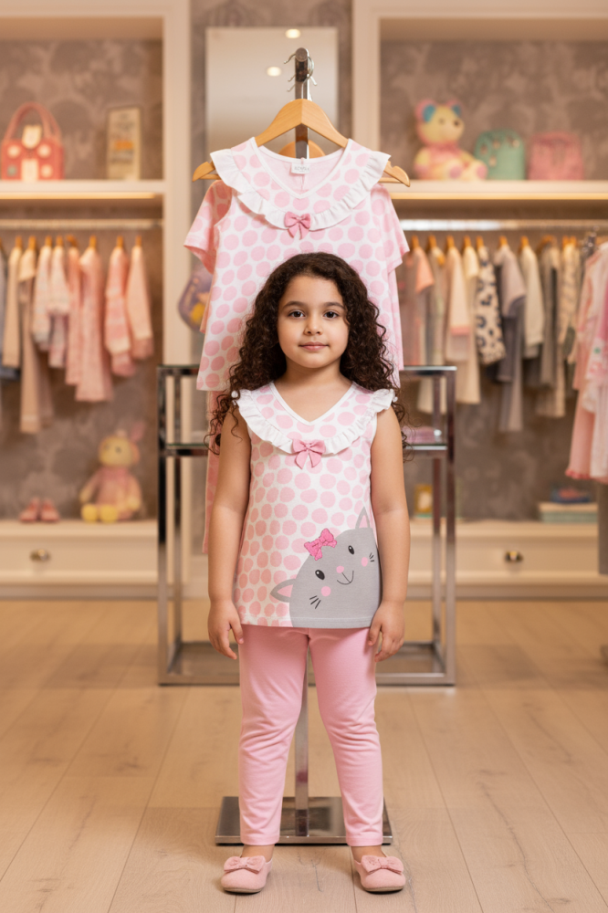 * بلوزة: تأتي بتصميم أنيق ومرح، باللونين الأبيض والوردي الجذاب، مطبوع عليها رسم "قطة" محاطة بدوائر ملونة، مما يضفي عليها لمسة من البراءة والجمال.