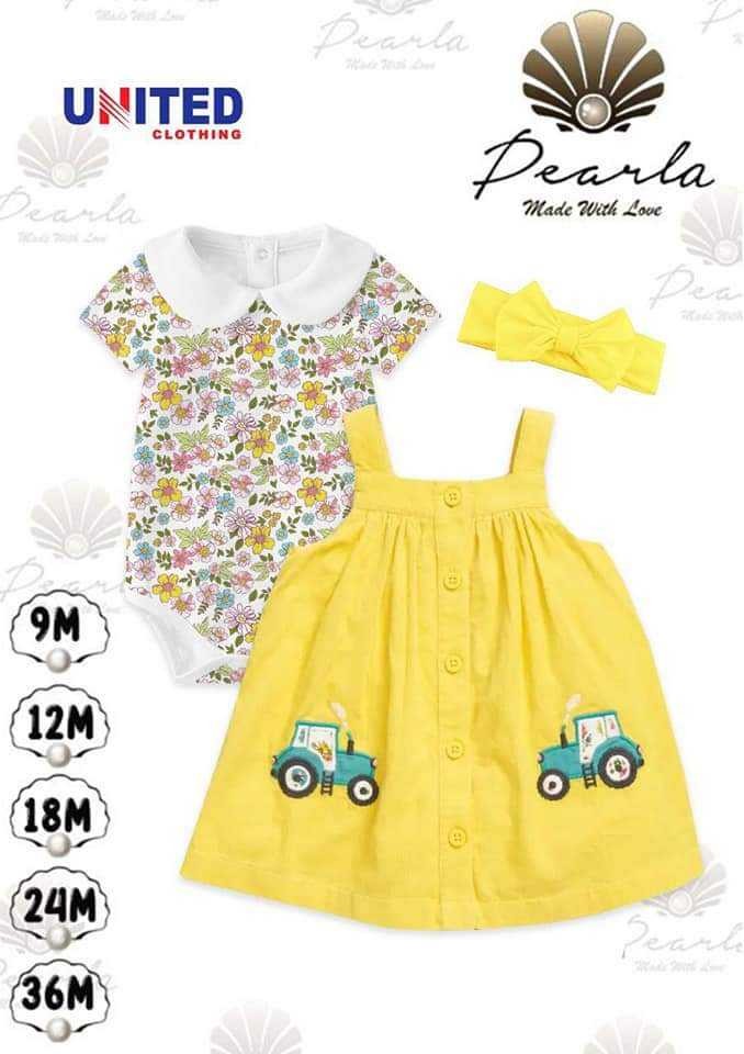 * فستان سالوبيت بتصميم مميز: بلون أصفر مبهج، يتميز بحمالات مكشكشة وجيوب أمامية مطرزة برسومات جرارات زراعية لطيفة، تضفي عليه لمسة من المرح والتفرد.